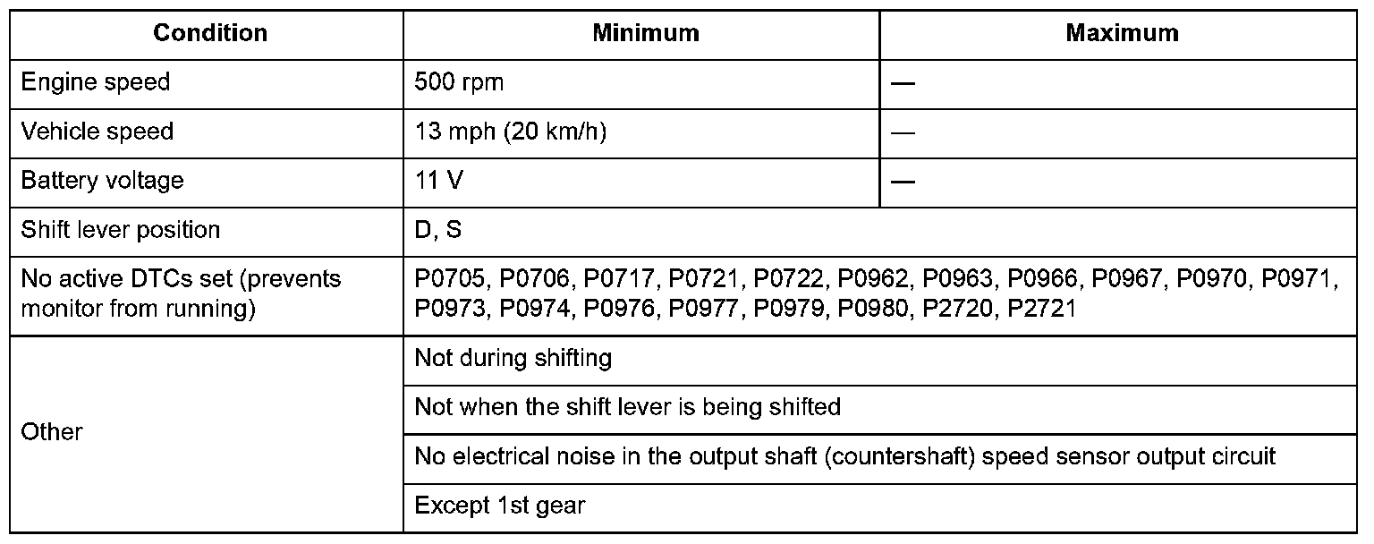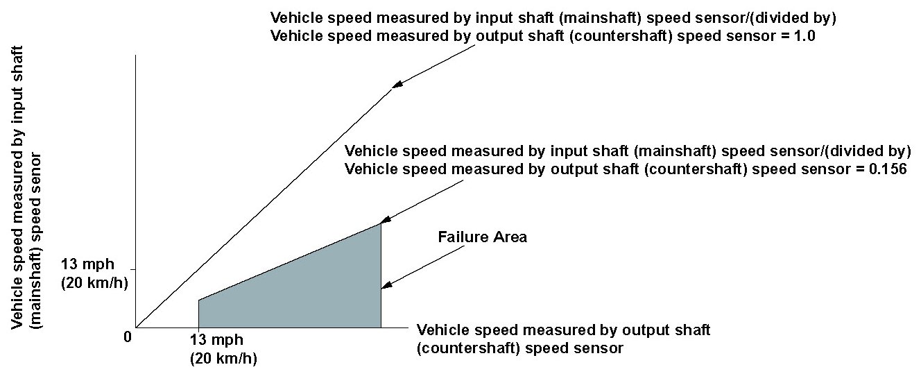 The vehicle speed measured by the input shaft (mainshaft) speed sensor/(divided by) the vehicle speed measured by the output shaft (countershaft) speed sensor is less than 0.156 for at least 10 seconds.