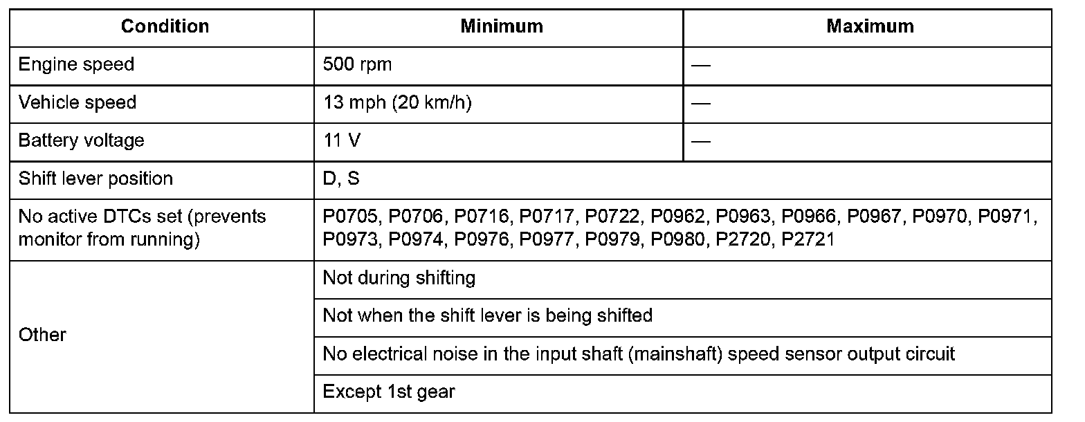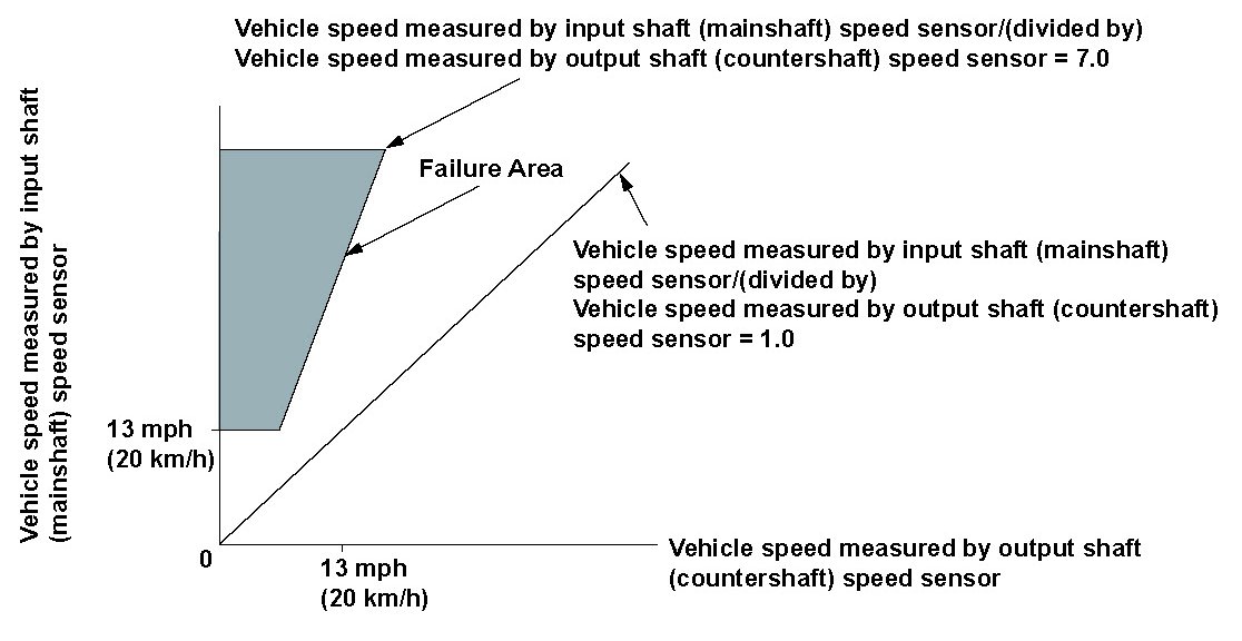 The ratio of the vehicle speed measured by the input shaft (mainshaft) speed sensor/(divided by) the vehicle speed measured by the output shaft (countershaft) speed sensor is greater than 7.0 for at least 10 seconds.