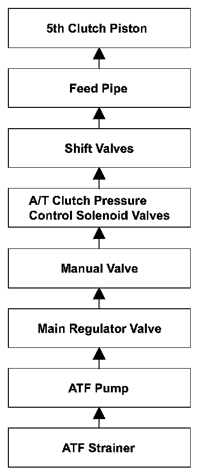 To engage 5th gear, A/T clutch pressure control solenoid valve pressure is supplied to the 5th clutch piston, engaging the 5th clutch, and the secondary shaft and the secondary shaft 5th gear are connected and revolve together. Hydraulic pressure is supplied to the 5th clutch through the ATF strainer --> the ATF pump --> the main regulator valve --> the manual valve --> the A/T clutch pressure control solenoid valves --> the shift valves --> the feed pipe --> the 5th clutch piston. (An A/T clutch pressure control solenoid valve failure and shift valve failure in the supply route above are detected by the malfunction detection of each solenoid valve.) The powertrain control module (PCM) computes the ratio of the input shaft (mainshaft) speed to the output shaft (countershaft) speed. When the ratio is not the 5th gear ratio, the PCM detects a malfunction of the hydraulic circuit or the 5th clutch and stores a DTC.
