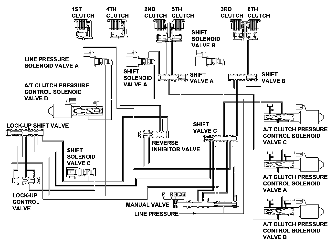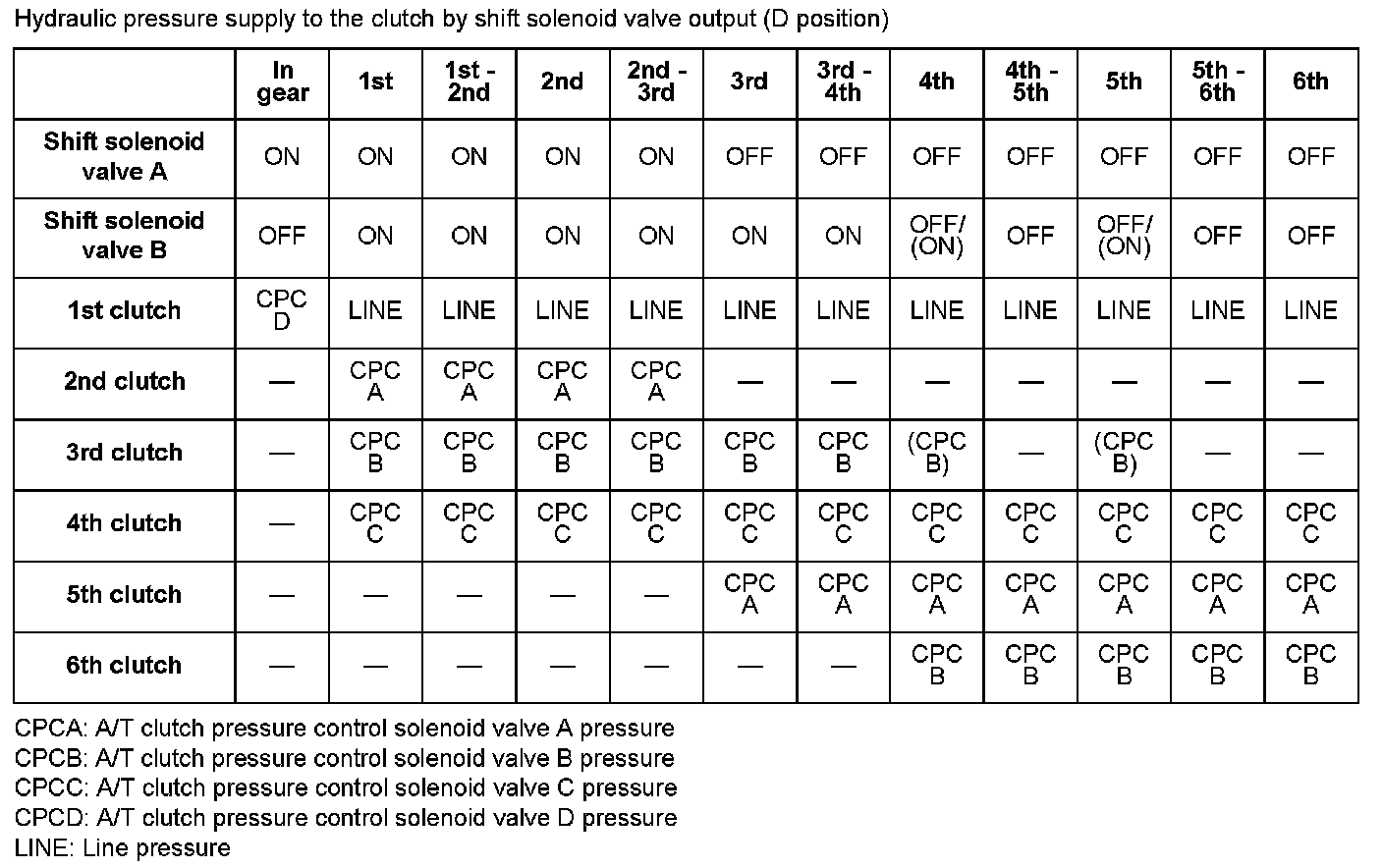 A/T clutch pressure control solenoid valve A is installed on the transmission housing. A/T clutch pressure control solenoid valve A is operated by the powertrain control module (PCM) and converts line pressure to A/T clutch pressure control solenoid valve A pressure. A signal from the PCM is output to A/T clutch pressure control solenoid valve A to supply proper A/T clutch pressure control solenoid valve A pressure to the correct gear clutch according to the shift schedule and the driving conditions. When the current from the PCM is high (ON), A/T clutch pressure control solenoid valve A operates and A/T clutch pressure control solenoid valve A pressure increases. When the current from the PCM is low (OFF), A/T clutch pressure control solenoid valve A turns off and A/T clutch pressure control solenoid valve A pressure decreases. The PCM monitors the input shaft (mainshaft) speed and the output shaft (countershaft) speed according to the shift status determined by the shift schedule, and monitors the transmission fluid pressure switch according to the shift status determined by the shift schedule. When an improper gear ratio is output for the shift schedule or when the wrong transmission fluid pressure switch is on for the shift schedule, the PCM detects an A/T clutch pressure control solenoid valve A stuck on failure and stores a DTC.