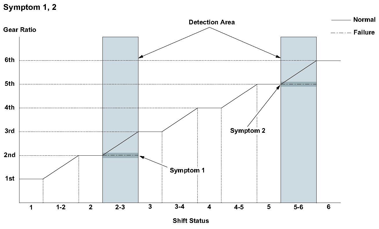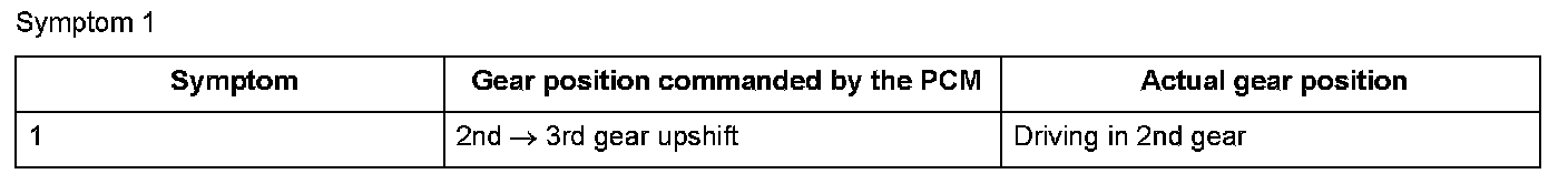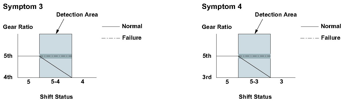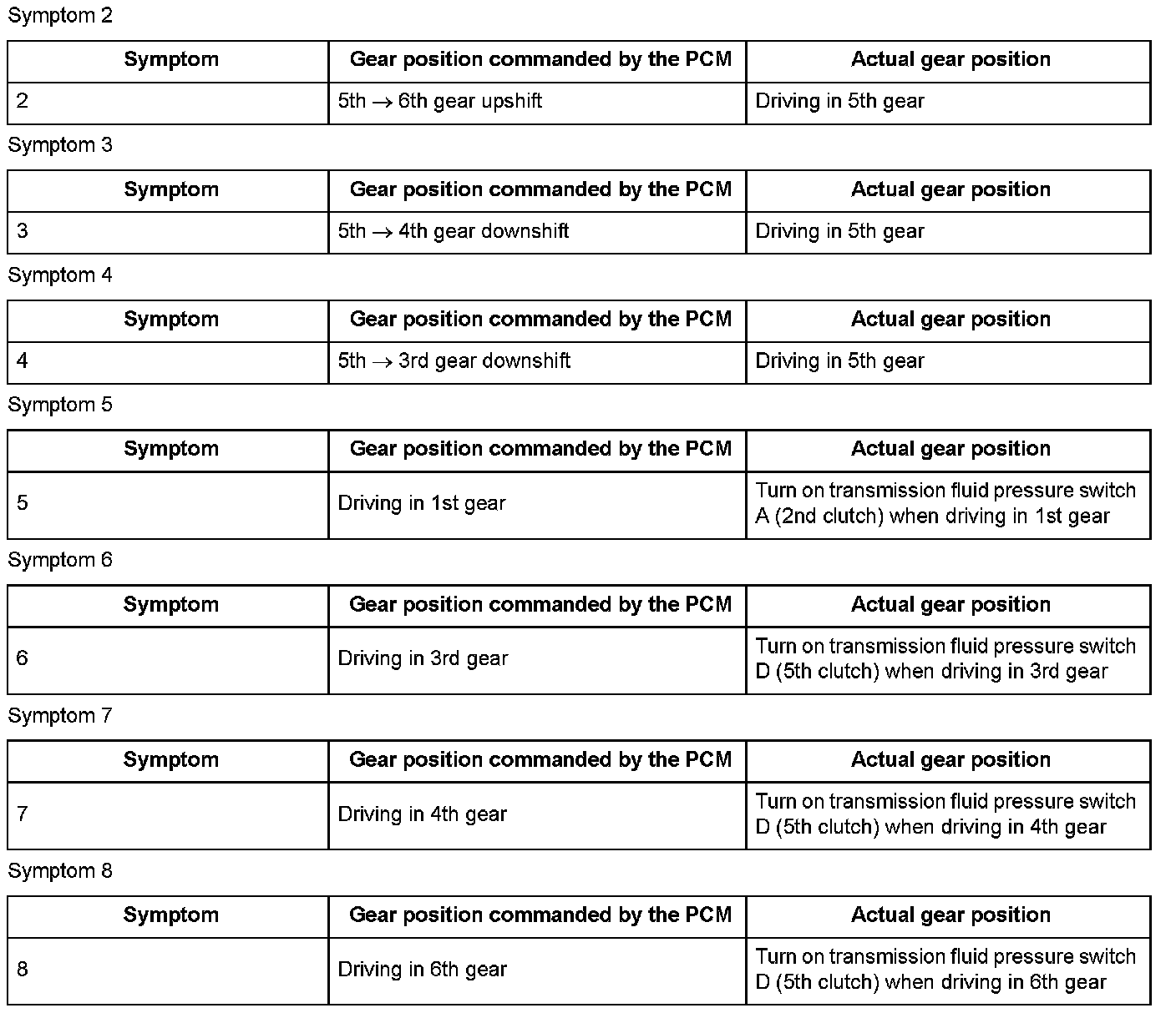 - The input signal from transmission fluid pressure switch A (2nd clutch) to the PCM is off for at least 4 seconds when the 5th gear shift is commanded or when the shift lever is in P, R, or N, after Symptom 5 occurred.