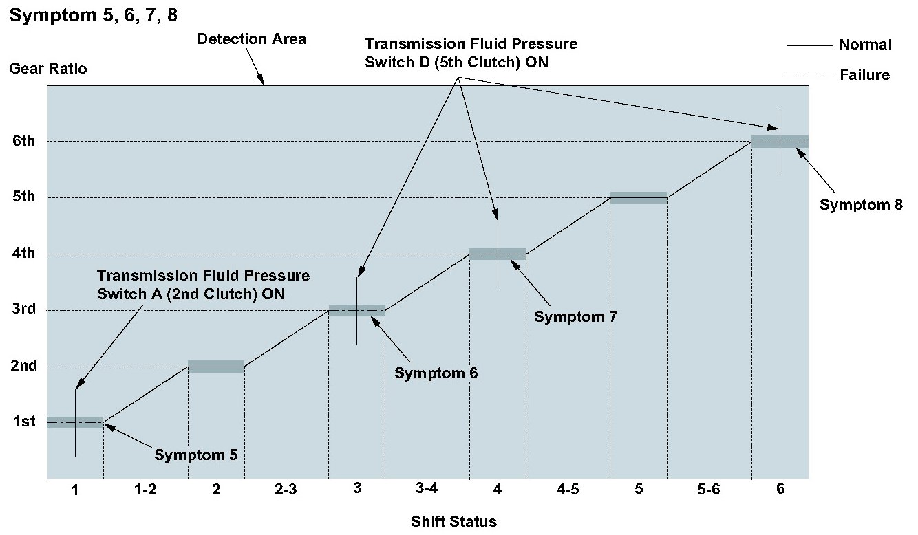 - The input signal from transmission fluid pressure switch D (5th clutch) to the PCM is off for at least 4 seconds when the 2nd gear shift is commanded or when the shift lever is in P, R, or N, after Symptom 6, Symptom 7, or Symptom 8 occurred.