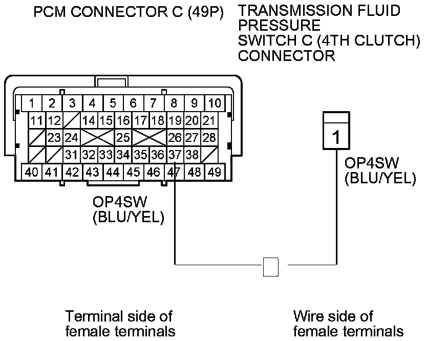 14. Check for continuity between PCM connector terminal C37 and the transmission fluid pressure switch C (4th clutch) connector terminal.
