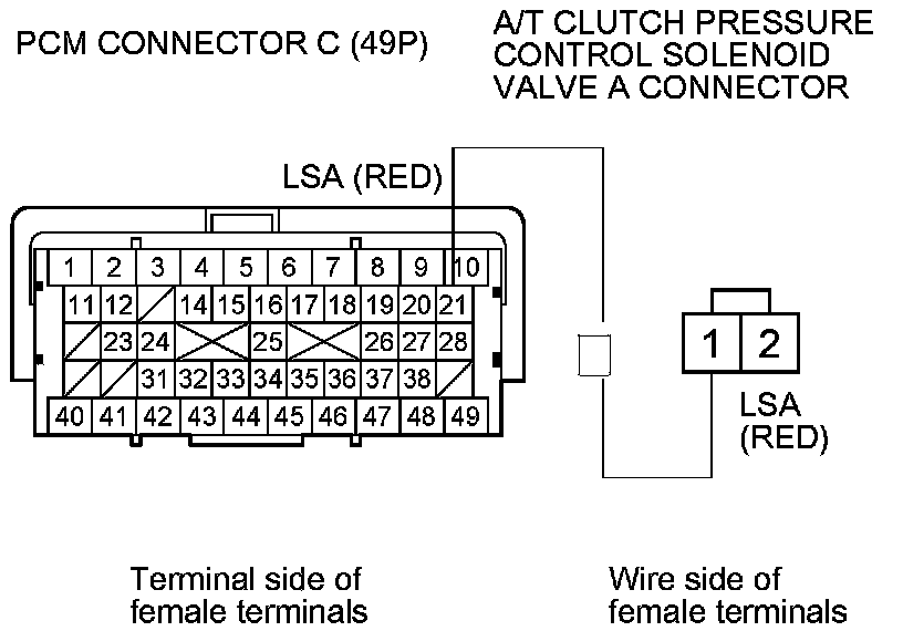 11. Check for continuity between PCM connector terminal C21 and A/T clutch pressure control solenoid valve A connector terminal No. 1.