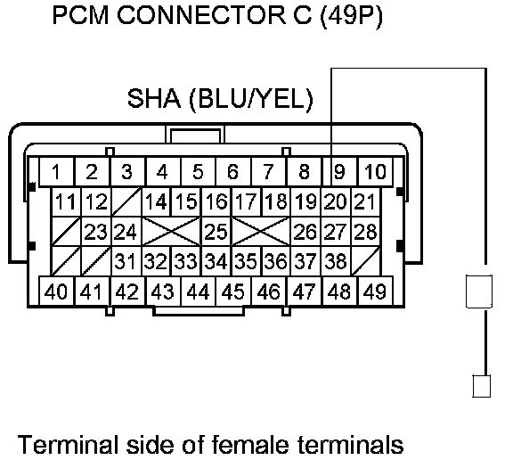 14. Check for continuity between PCM connector terminals C20 and body ground.