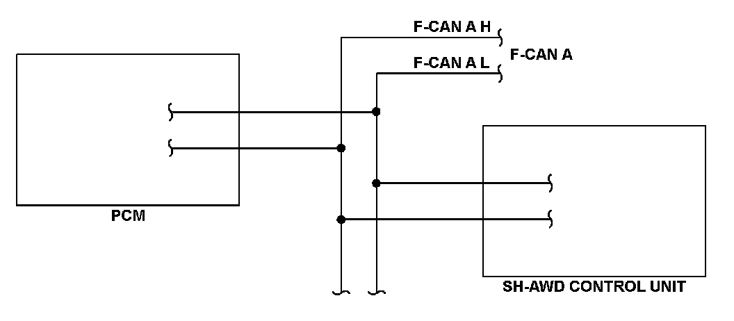 The controller area network (CAN) transmits/receives pulsing signals to/from the control modules simultaneously by using two signal lines (F-CAN A H and F-CAN A L). When the powertrain control module (PCM) does not receive the signals from the SH-AWD control unit via the F-CAN A lines for a set time, the PCM detects a malfunction and stores a DTC.