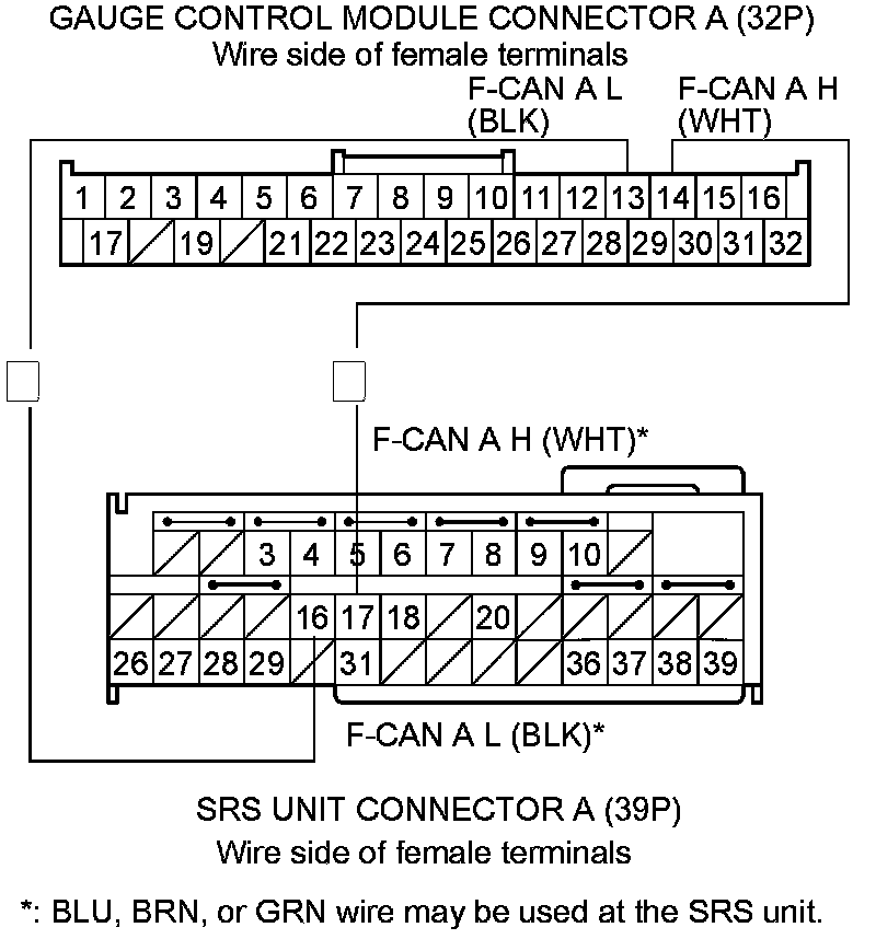 9. Check for continuity between gauge control module connector A (32P) terminals No. 13 and No. 14 and SRS unit connector A (39P) terminals No. 16 and No. 17 respectively.