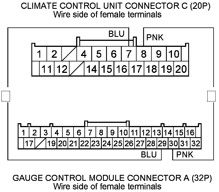 10. Check for continuity between the following terminals of gauge control module connector A (32P) and climate control unit connector C (20P).