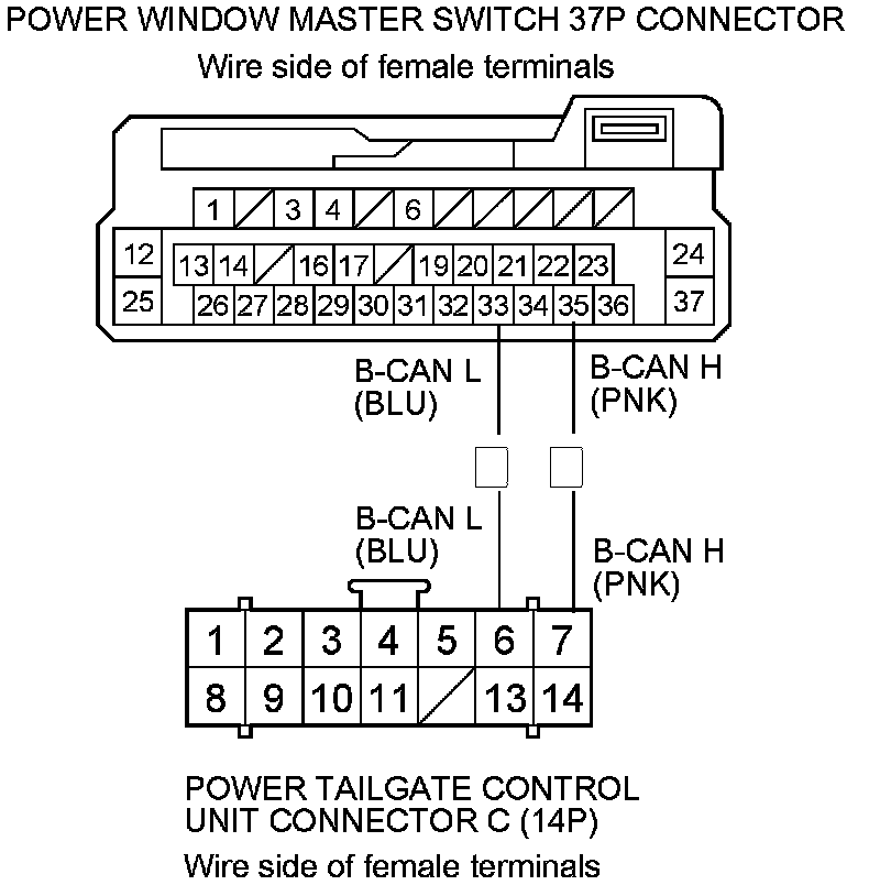 9. Check for continuity between door power window master switch 37P connector terminals No. 33 and No. 35 and power tailgate control unit connector C (14P) terminals No. 6 and No. 7 respectively.