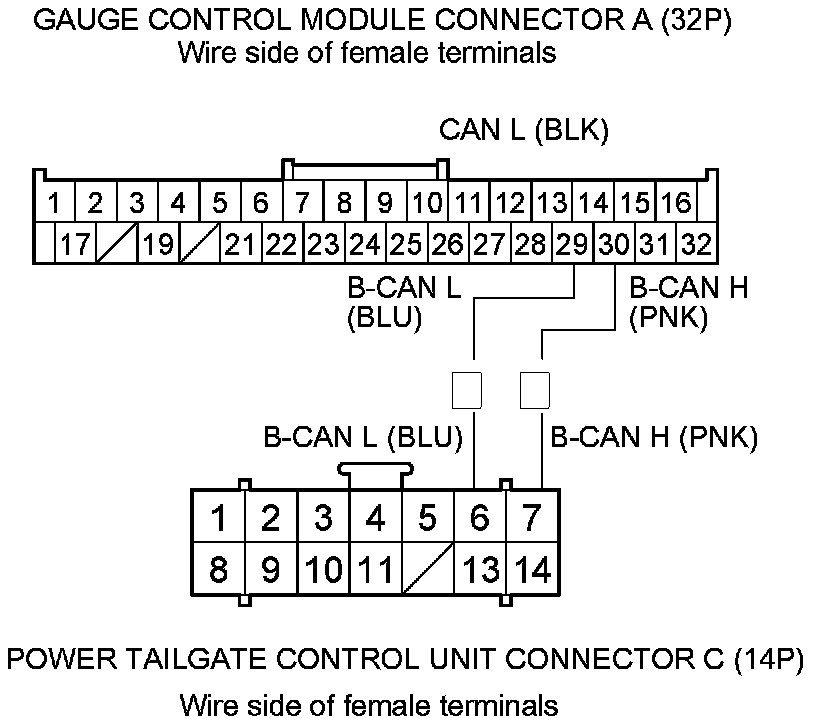 8. Check for continuity between gauge control module connector A (32P) terminals No. 29 and No. 30 and power tailgate control unit connector C (14P) terminals No. 6 and No. 7 respectively.