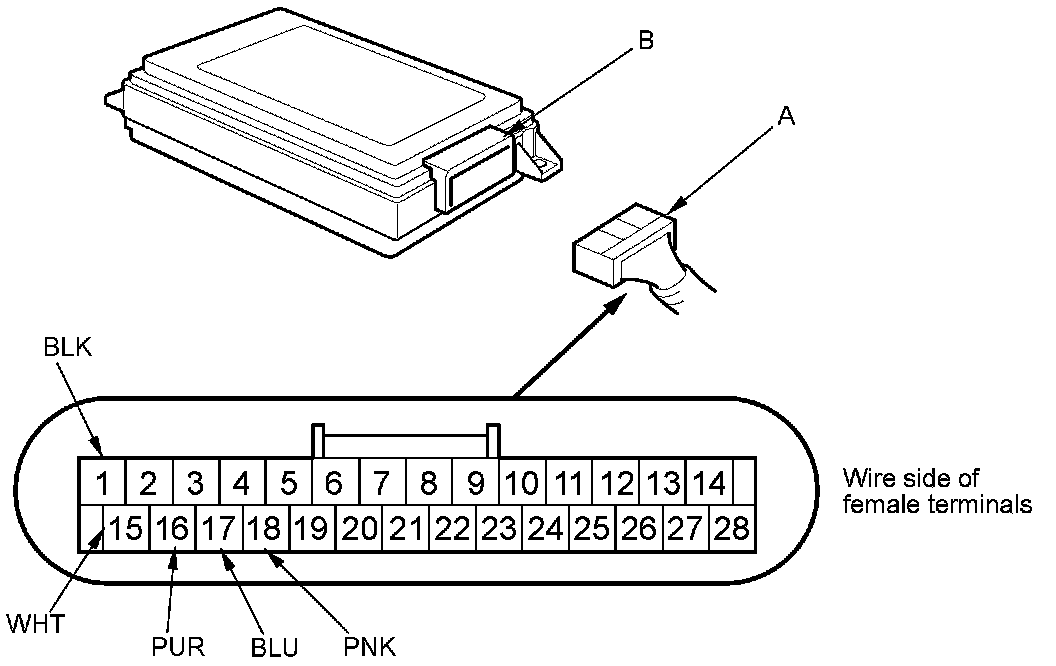 2. Inspect the connector (A) and socket (B) terminals for a good pinfit to be sure they are all making good contact.