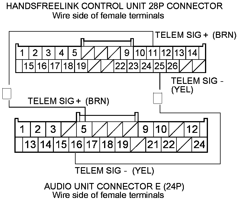 11. Check for continuity between HandsFreeLink control unit 28P connector terminals No. 11 and No. 25 and audio unit connector B (24P) terminals No. 5 and No. 16 respectively.