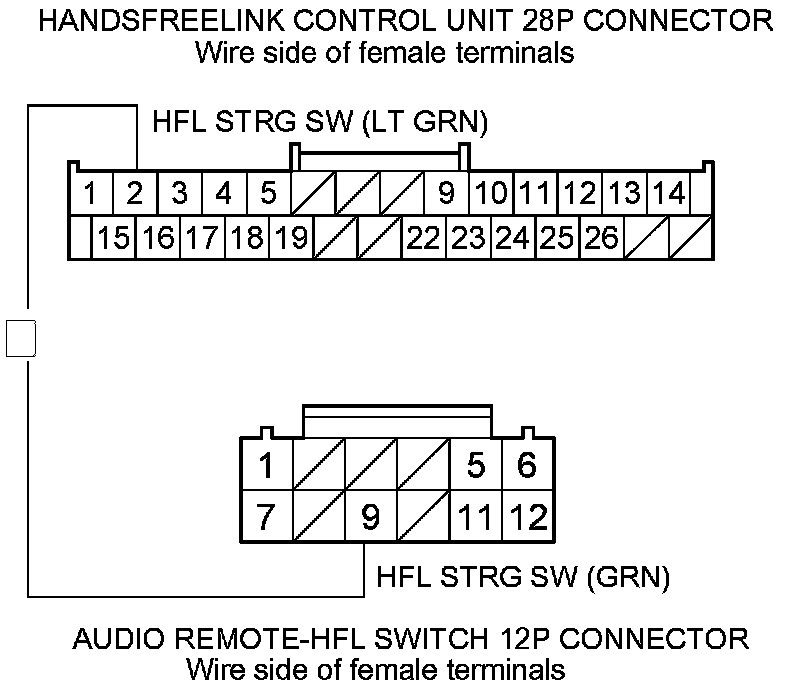 15. Check for continuity between HandsFreeLink control unit 28P connector terminal No. 2 and audio remote-HFL switch 12P connector terminal No. 9.