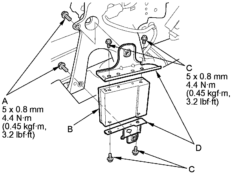 2. Remove the bolts (A) and the USB adapter control unit (B), then remove the bolts (C) and brackets (D) from the USB adapter control unit.