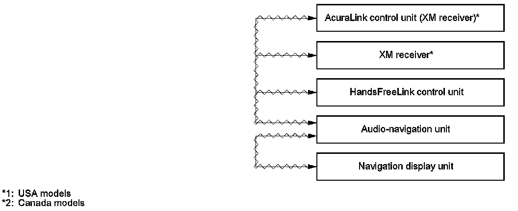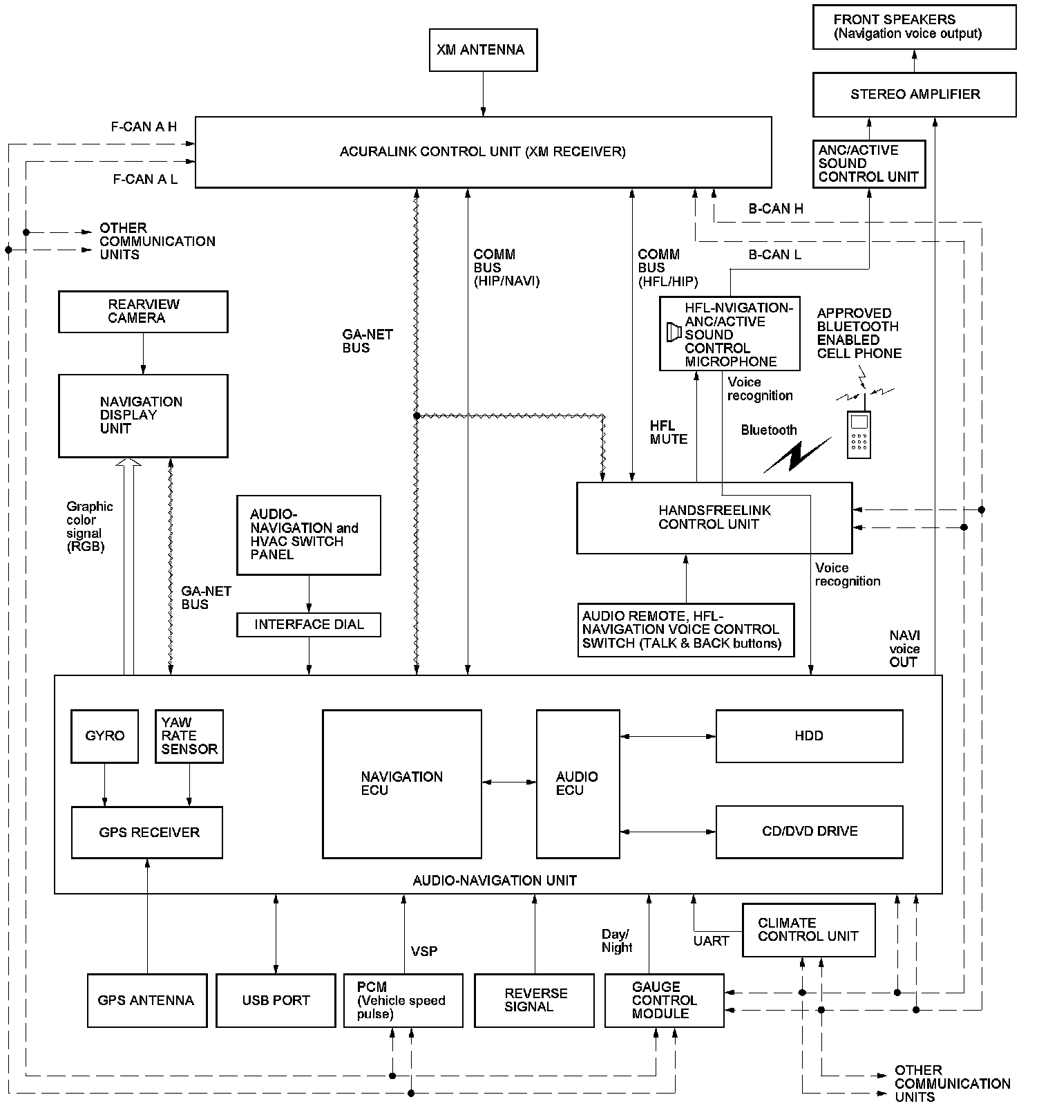 The GA-Net II communication bus passes information back and forth between the navigation display, the audio-navigation unit, AcuraLink control unit (XM receiver), and the audio system. The information passed on this bus is audio settings directed by the audio-navigation unit.