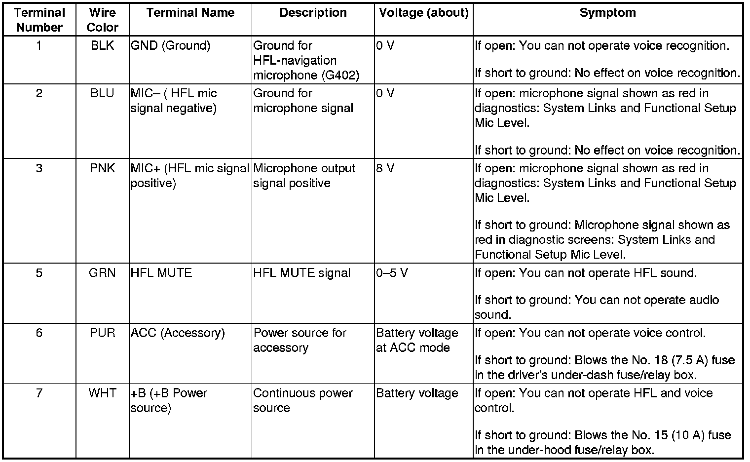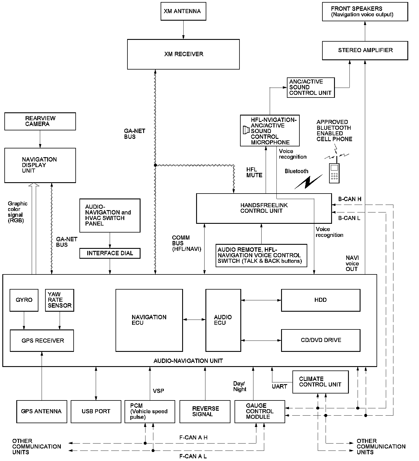 The GA-Net bus passes audio, navigation, and HFL commands throughout the audio, navigation, and HFL components. These commands include navigation audio/XM selections by voice, and XM station and music title names. Because the entire bus is interconnected between components, an open or short in the GA-Net bus harness may cause any or all of these functions to become inoperative.
