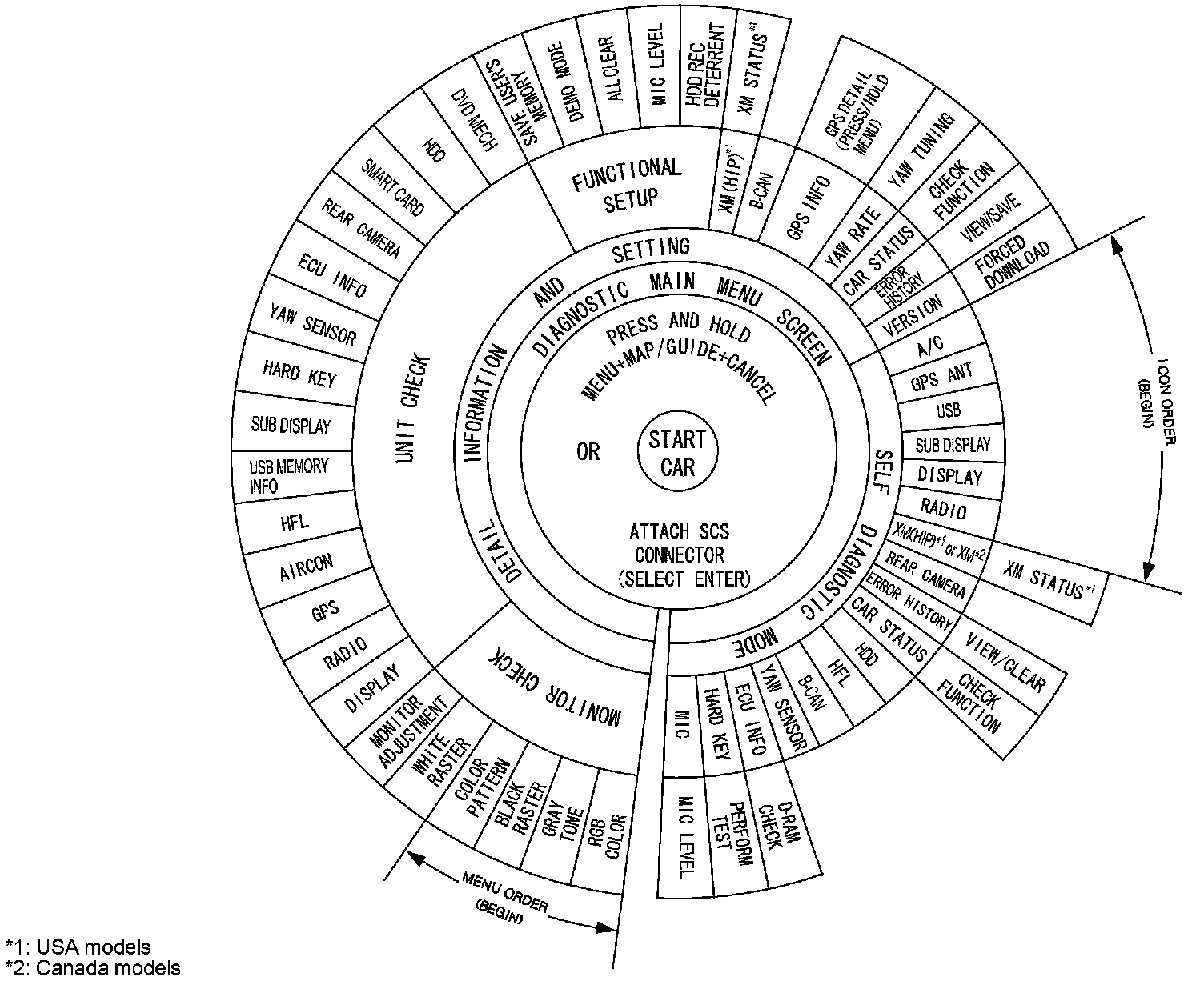 Access to the diagnostic features begins by starting the vehicle. This is necessary so the system can check the other systems connected by various busses. After starting the vehicle you can enter the diagnostic mode either by pressing and holding MENU, MAP/GUIDE, and CANCEL, or by connecting the 2-PIN SCS service connector.