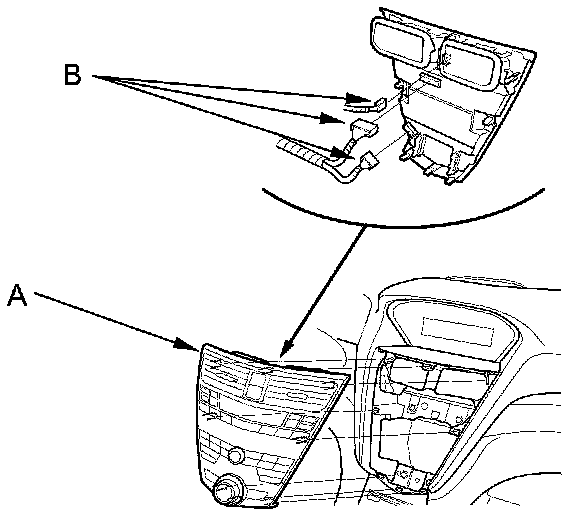 1. Pull the audio and HVAC switch panel (A) out, then disconnect the connectors (B) from the audio and HVAC switch panel.