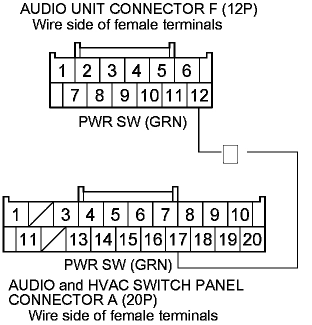 7. Check for continuity between audio unit connector F (12P) terminal No. 12 and audio and HVAC switch panel connector A (20P) terminal No. 17.