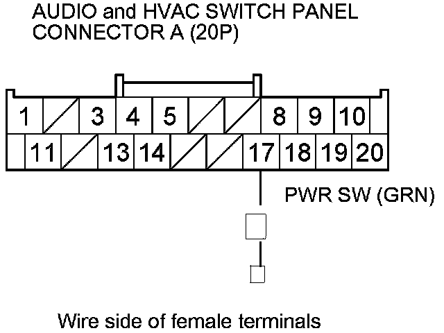 6. Check for continuity between audio and HVAC switch panel connector A (20P) terminal No. 17 and body ground.
