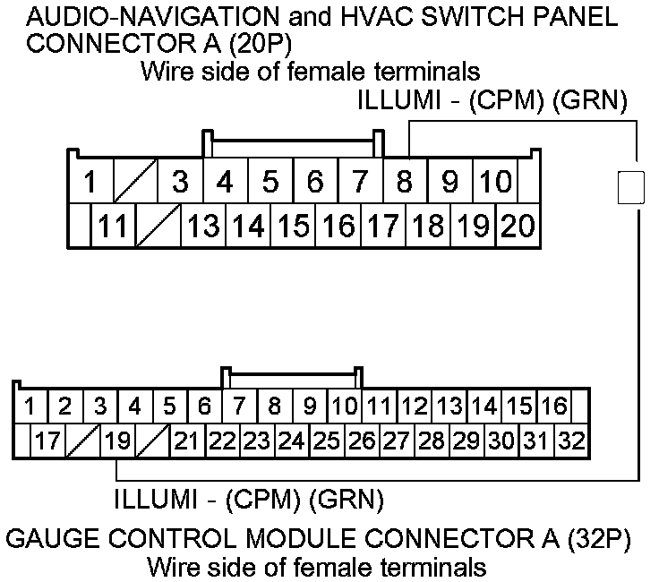 7. Check for continuity between audio-navigation and HVAC switch panel connector A (20P) terminal No. 8 and gauge control module connector A (32P) terminal No. 19.