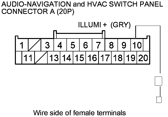 9. With the headlight switch on, measure the voltage between audio-navigation and HVAC switch panel connector A (20P) terminal No. 10 and body ground.