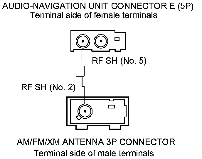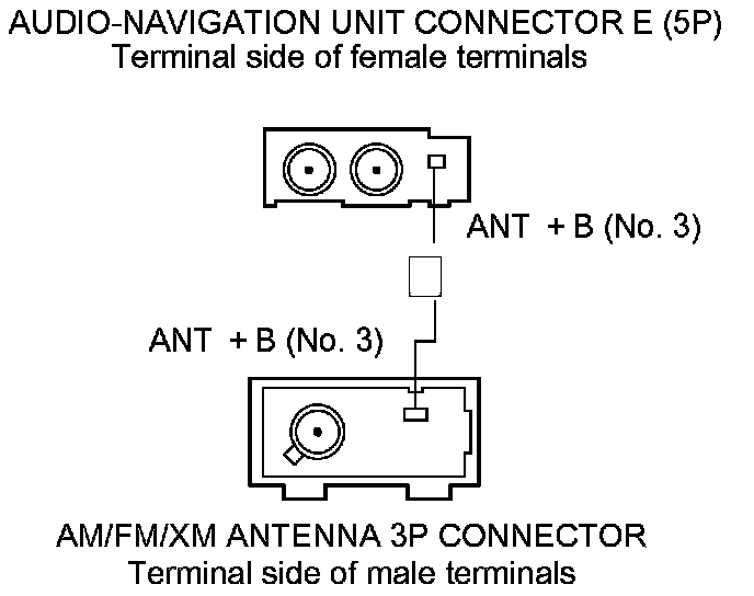 12. Check for continuity between audio-navigation unit connector E (5P) terminal No. 3 and AM/FM/XM antenna 3P connector terminal No. 3.