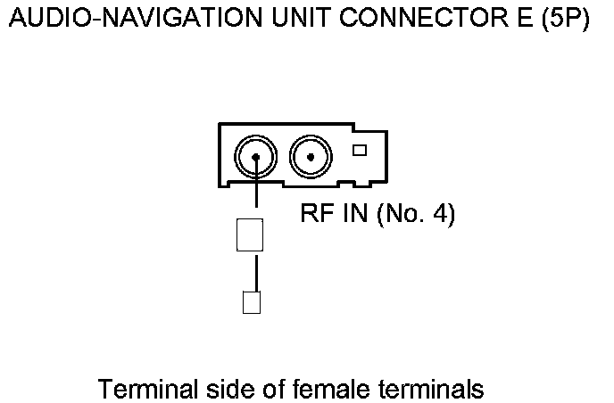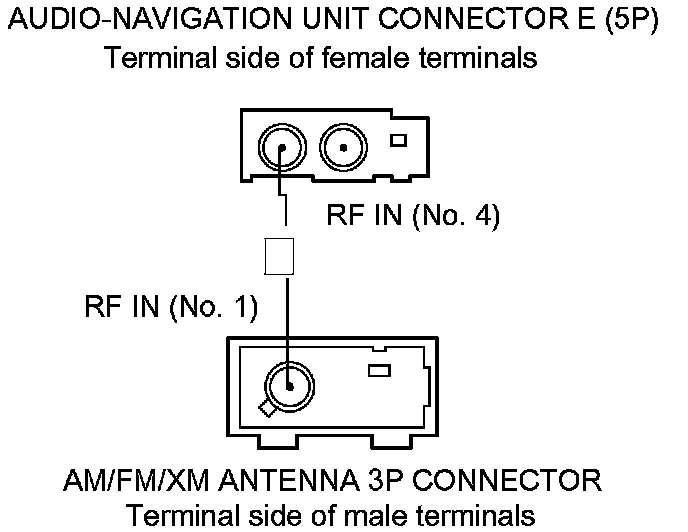 17. Check for continuity between audio-navigation unit connector E (5P) terminal No. 4 and AM/FM/XM antenna 3P connector terminal No. 1.