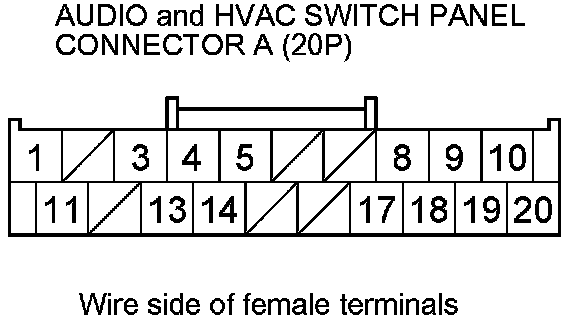 7. Check for continuity between the audio and HVAC switch panel connector A (20P) terminals and body ground according to the table.