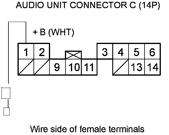 7. Measure the voltage between audio unit connector C (14P) terminal No. 1 and body ground.