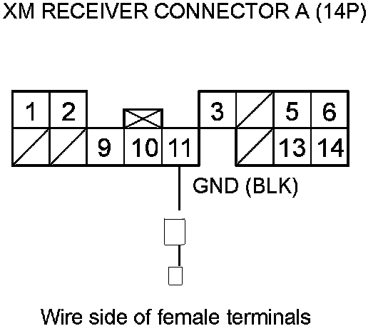 9. Measure the voltage between XM receiver connector A (14P) terminal No. 11 and body ground.