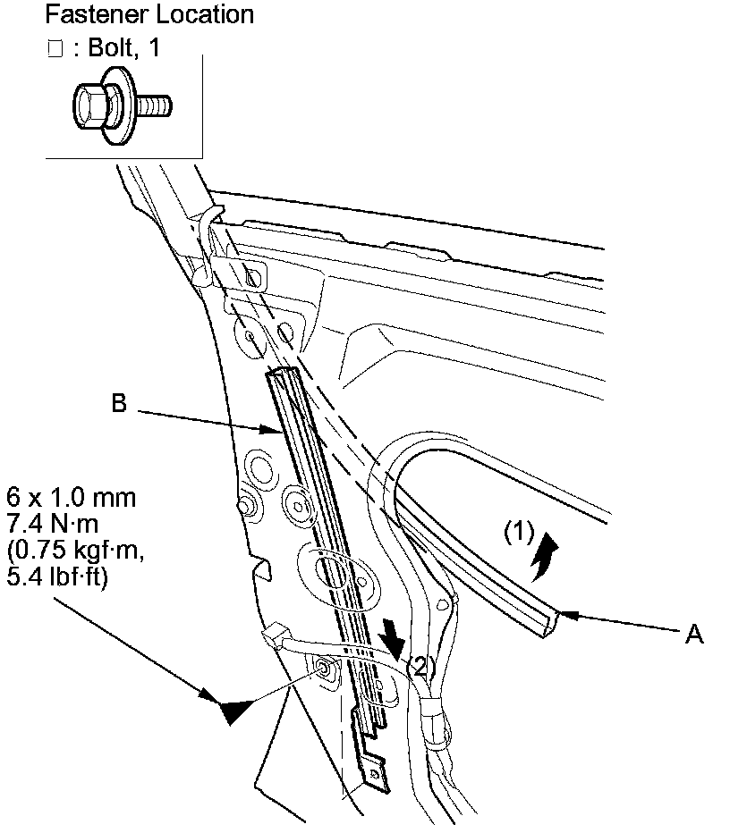 6. Pull away the glass run channel (A) as needed, and remove the bolt, then remove the center lower channel (B) by pulling it downward.