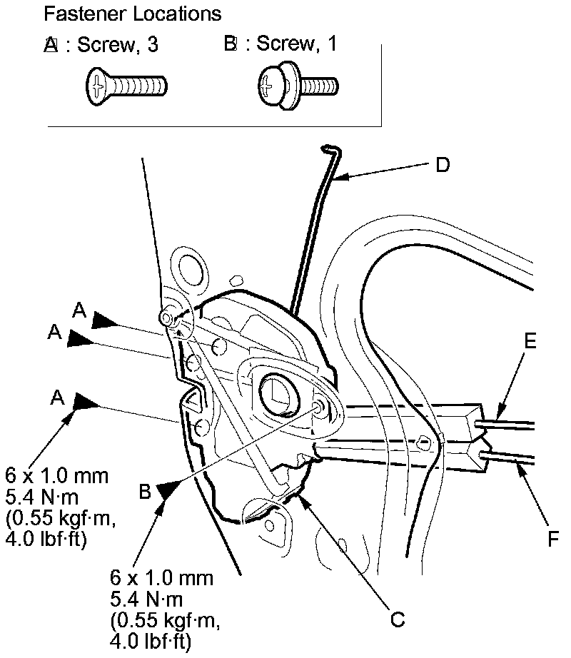 NOTE: Take care not to bend the outer handle rod (D), the latch cable (E), or the inner handle cable (F).