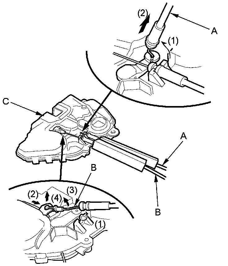 10. Disconnect the latch cable (A) and the inner handle cable (B) from the latch (C).