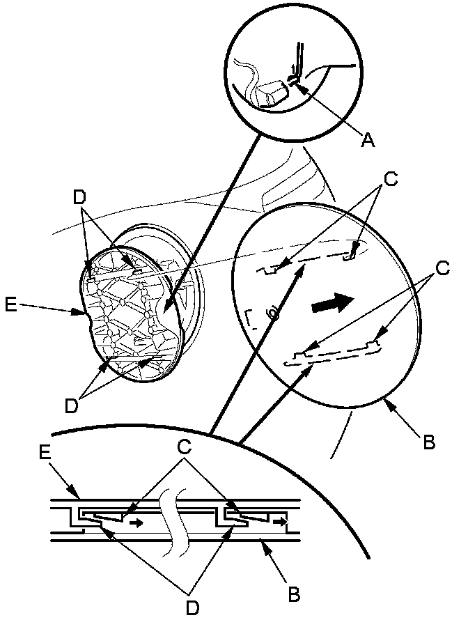 1. While prying the hook (A) up with a trim tool, slide the fuel fill door (B) back to release four wedges (C) from the hooks (D) of the fuel fill door hinge (E), then remove the fuel fill door.