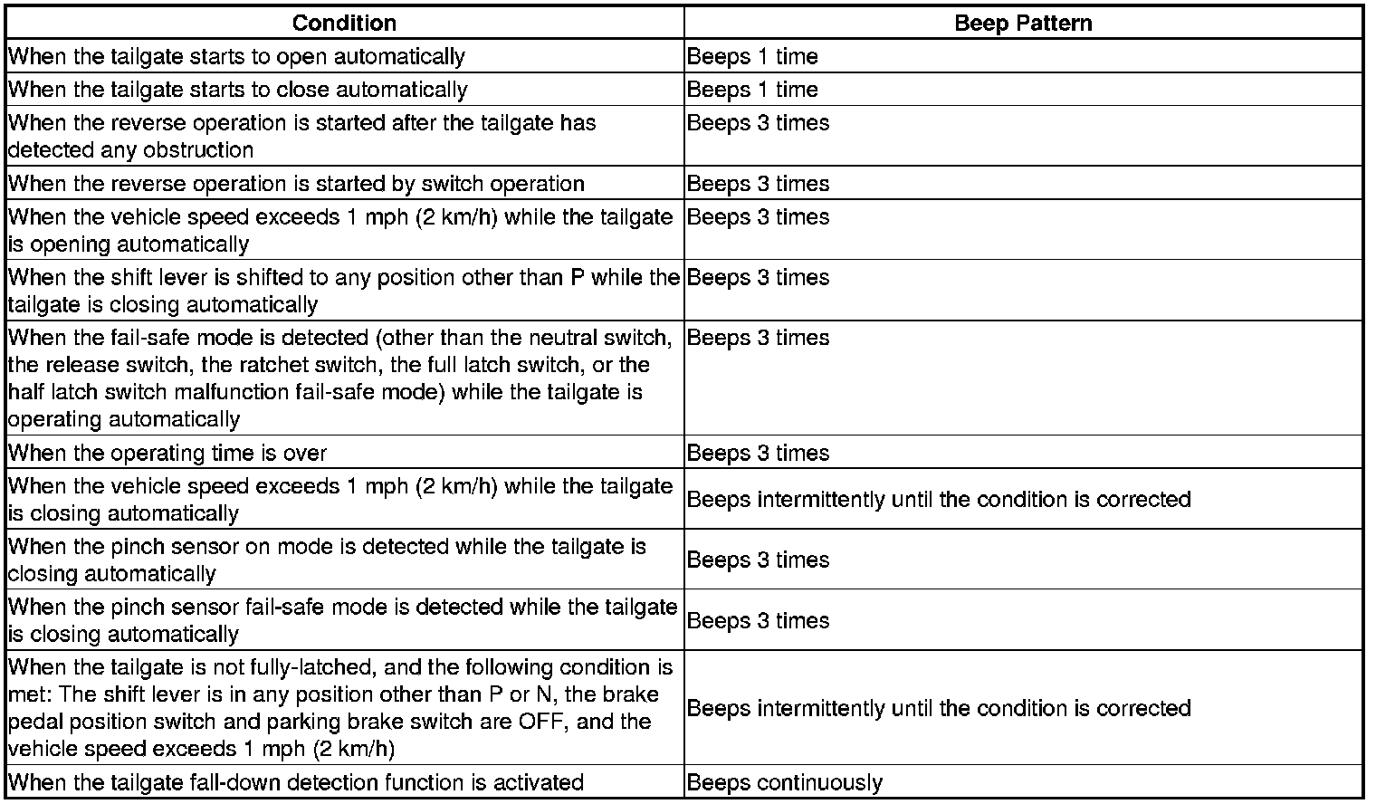 If any obstruction is detected while the tailgate is automatically opening or closing, the tailgate will stop and the reverse operation is activated. An obstruction is detected by the tailgate pinch sensor and the pulser in the drive unit. If the obstruction is detected when the shift lever is in any position other than P, or the vehicle speed exceeds 1 mph (2 km/h), the tailgate stops moving immediately.