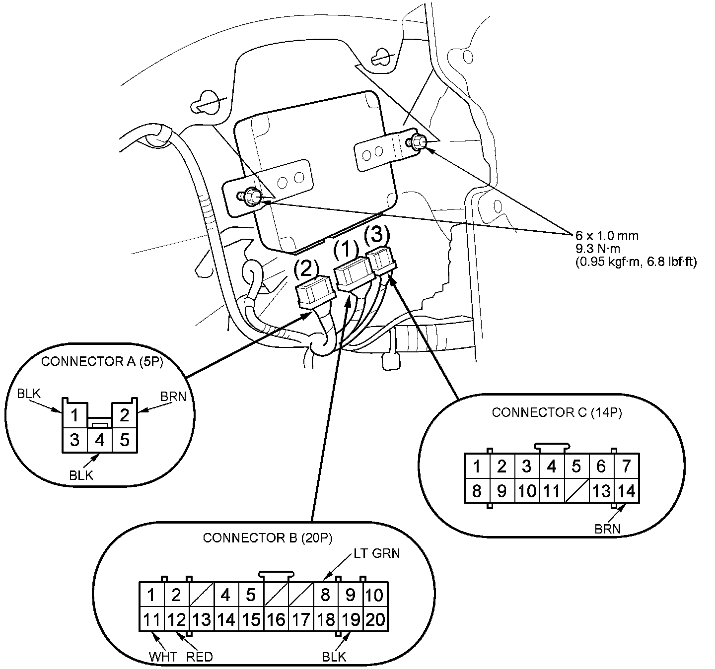 3. Disconnect power tailgate control unit connectors A (5P), B (20P), and C (14P) in the order shown.