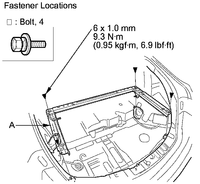 2. Remove the bolts, then remove the rear cargo support beam (A).