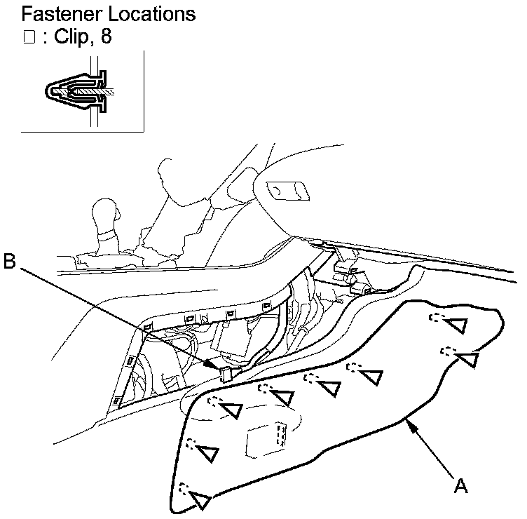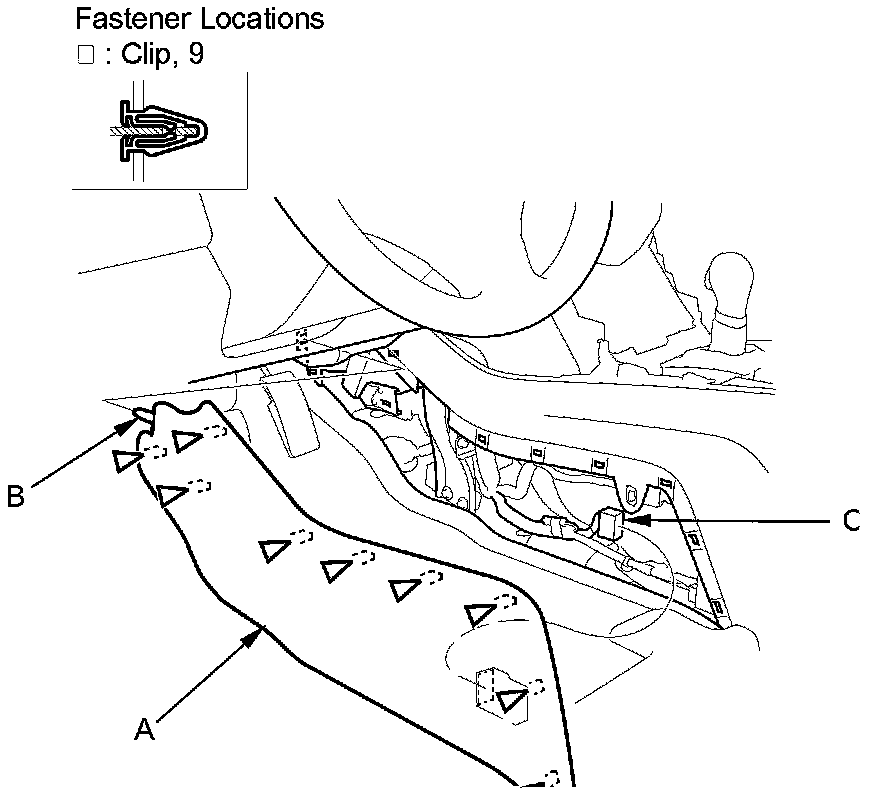 8. Without navigation system: From passenger's side, disconnect the USB adapter connector (A) and the USB main harness connector (B). Detach the harness clips (C).