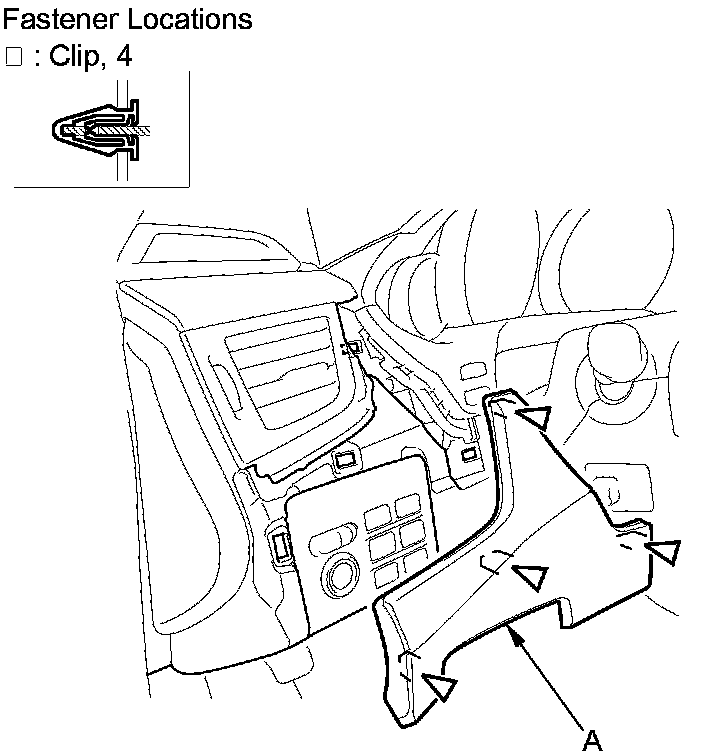 1. Pry up the edge of the driver's outer dashboard trim (A) to detach the clips, and remove the trim.