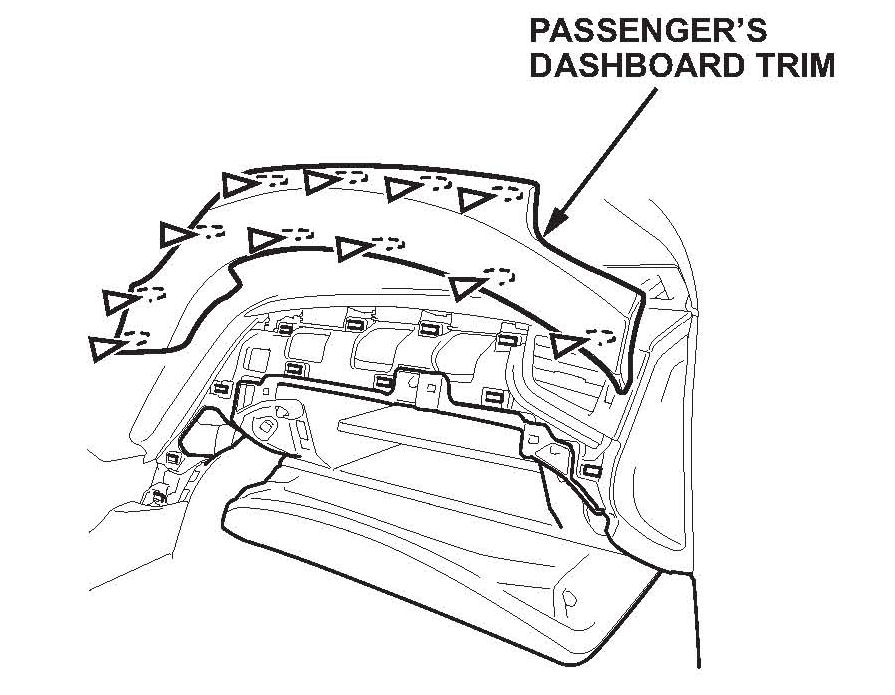 5. To avoid possible squeaks or rattles, replace any damaged clips on the passenger's dashboard trim Then reinstall the trim, working left to right.