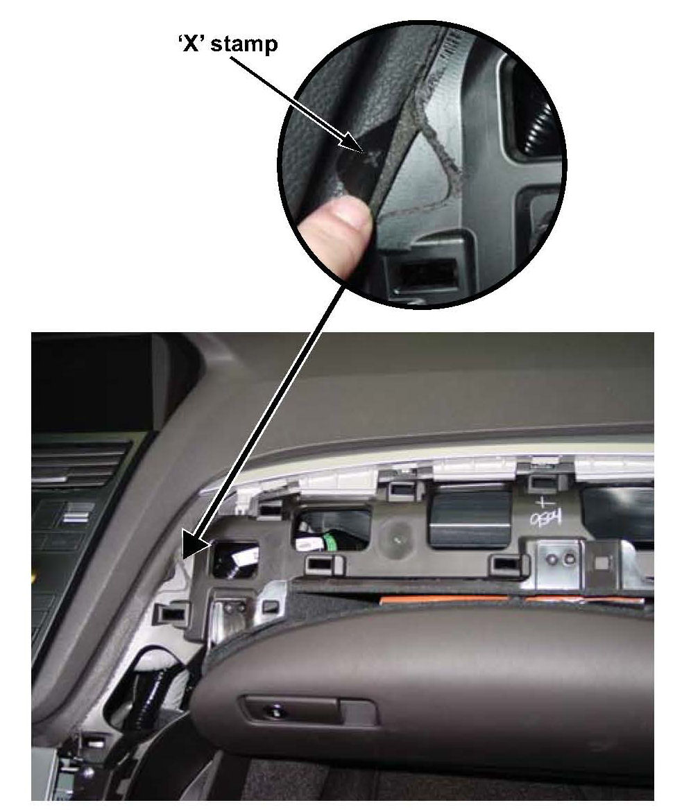 Check the dashboard for an X-mark under the left side of the passenger's dashboard trim. If there is no X-mark, replace the dashboard.