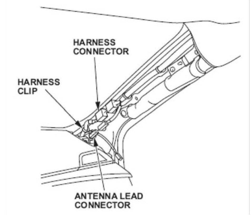 28. On the passenger's side, reattach the harness clip, then reconnect the antenna lead connector and the roof wire connector.