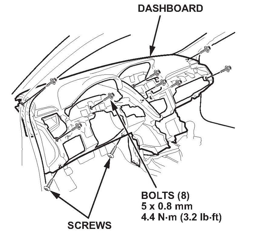 27. Reinstall the two screws on the dashboard, then torque the eight dashboard bolts to 4.4 N.m (38 lb-in).