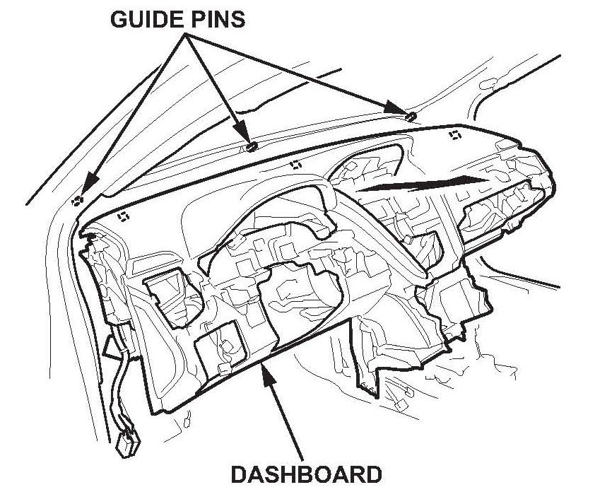 26. With the help of an assistant, carefully guide the new dashboard in through the front door opening. Make sure that the dashboard fits correctly over its guide pins, and that the dashboard wire harness is not pinched.