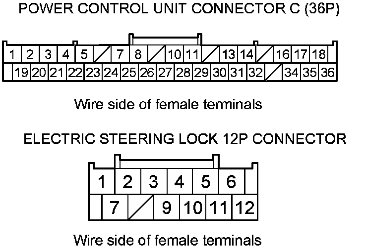 29. Check for continuity between electric steering lock 12P connector terminals and power control unit connector C (36P) terminals as shown.