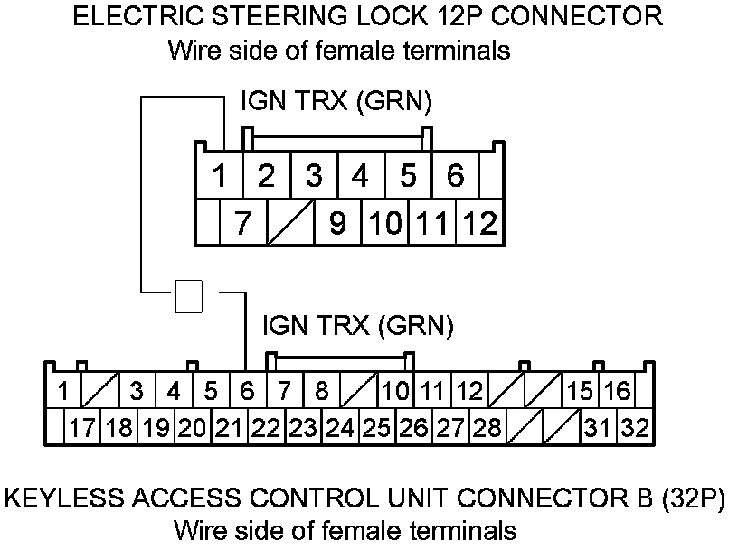 36. Check for continuity between keyless access control unit connector A (36P) and B (32P) terminals and electric steering lock 12P connector terminals as shown.
