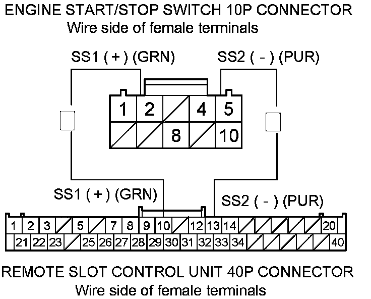 41. Check for continuity between remote slot control unit 40P connector terminals No. 10 and No. 13 and engine start/stop switch 10P connector terminals No. 2 and No. 5 respectively.