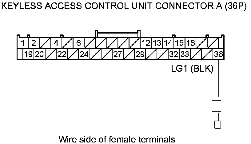 43. Check for continuity between body ground and keyless access control unit connectors A (36P) and B (32P) terminals as shown.