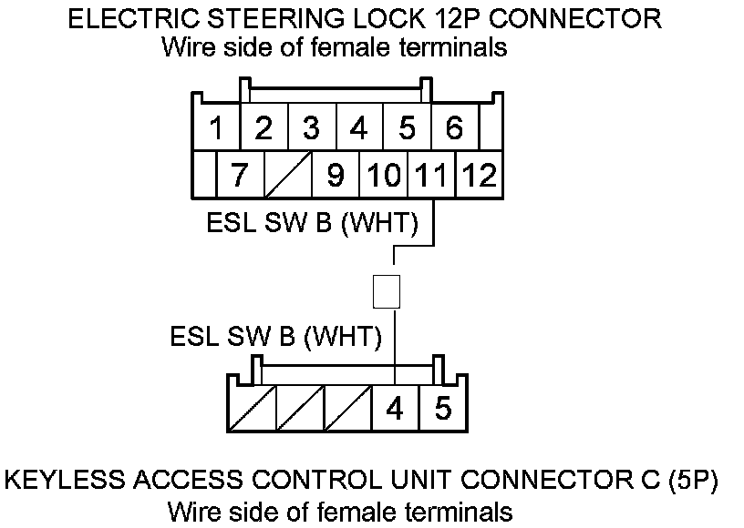 32. Check for continuity between electric steering lock 12P connector terminal No. 11 and keyless access control unit connector C (5P) terminal No. 4.